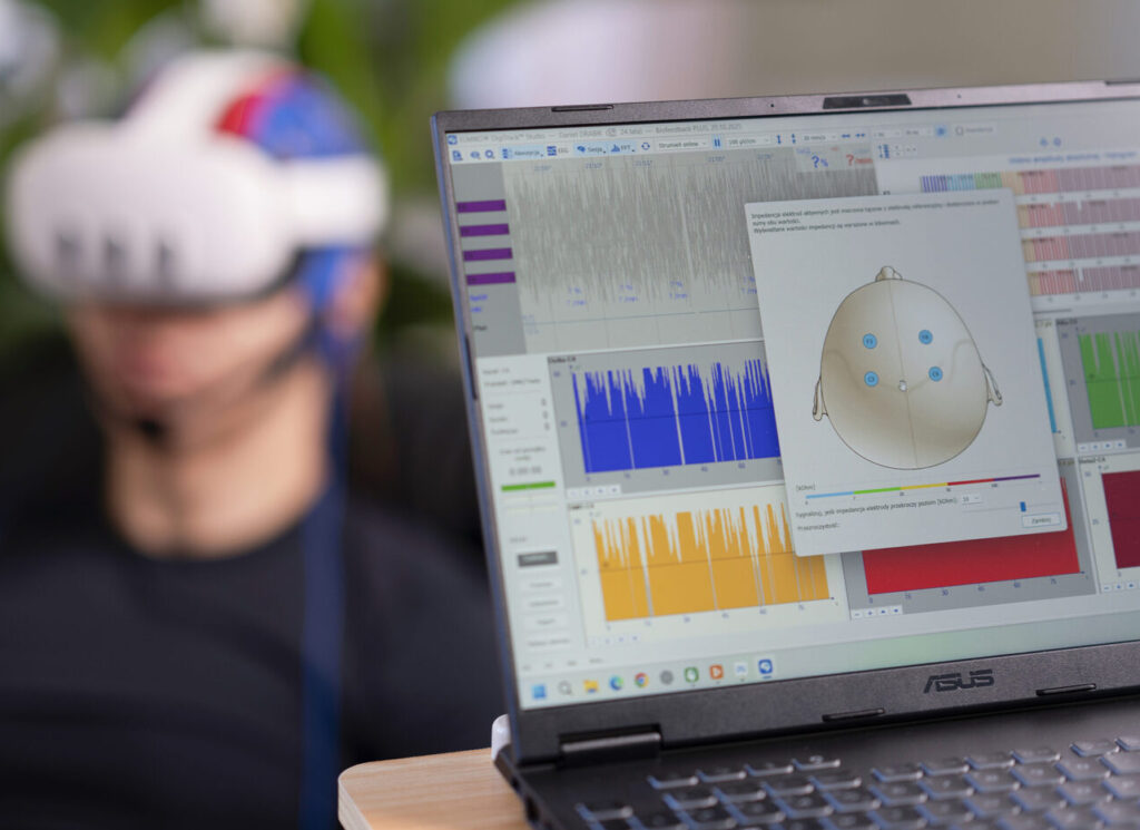 Biofeedback to bezpieczna i nowoczesna metoda z wykorzystaniem EEG, która pozwala zobaczyć, jak działa Twój mózg i uczyć Cię świadomie wpływać na jego funkcjonowanie. Czujniki rejestrują fale mózgowe, a Ty wykonujesz zadania w formie gier lub filmów reagujących na poziom skupienia.